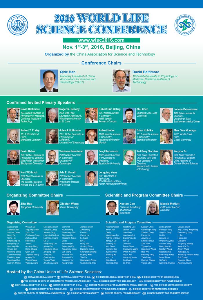 2016世界生命科学大会由中国科学技术协会和中国生命科学学会联合体共同举办,将于2016年11月1~3日在中国北京国家会议中心举行。全国政协副主席、中国科学技术协会名誉主席韩启德院士和1975年诺贝尔生理学或医学奖获得者David Baltimore教授共同担任大会主席。
