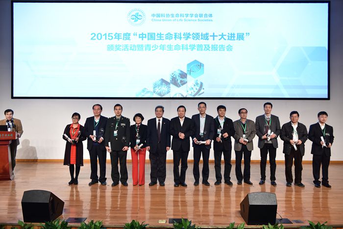 尚勇与饶子和共同为2015年度“中国生命科学领域十大进展”的项目牵头科学家颁发了奖杯和证书。饶子和介绍了2015年度“中国生命科学领域十大进展”评选的基本情况。