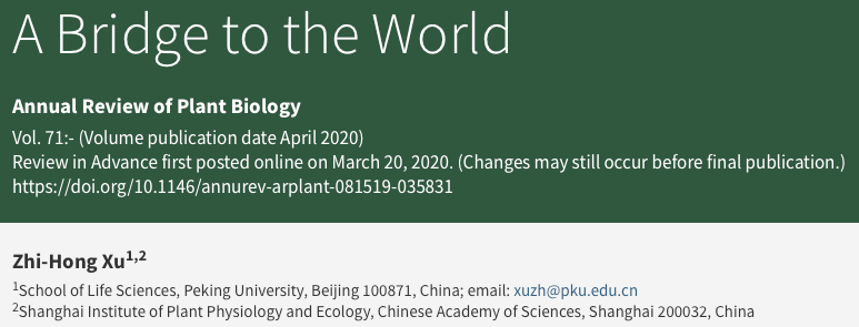 2020年3月20日,北京大学前校长,中国植物学会名誉理事长许智宏院士应邀在《植物生物学年评》(Annual Review of Plant Biology)撰写题为“A Bridge to the World”的自传型学术综述(DOI:10.1146/annurev-arplant -081519-035831)。