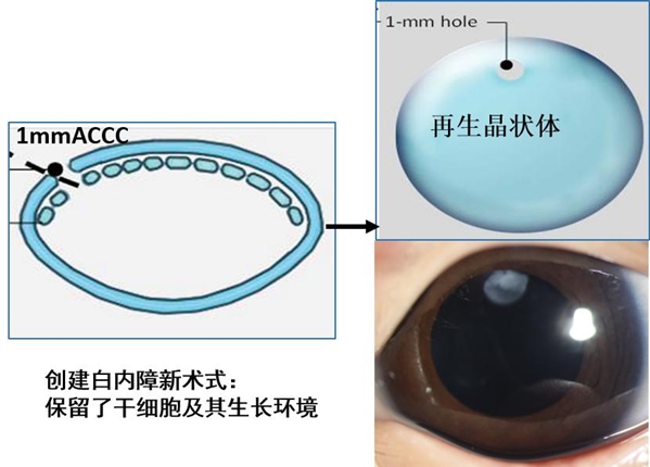 中山大学中山眼科中心刘奕志教授带领团队,历经18年研究,发现了晶状体上皮干细胞;为了利用干细胞的再生潜能实现组织修复,设计并创建了一种新的微创白内障手术方法,保留了自体晶状体干细胞及其再生的微环境,长出了功能性的晶状体,已用于临床治疗婴幼儿白内障,提高了患儿视力,降低了并发
