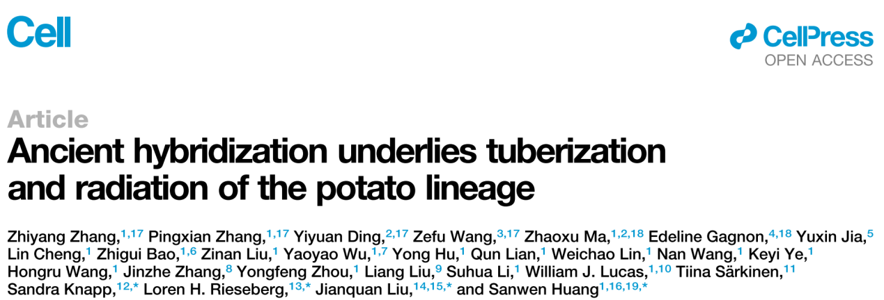 北京时间7月31日,18luck投注副理事长、中国农业科学院深圳农业基因组研究所(岭南现代农业科学与技术广东省实验室深圳分中心)黄三文团队联合中外科研团队在《细胞(Cell)》上发表了题为“Ancient hybridization underlies tuberization and radiation of the potato lineage”的研究论文。该研究首次揭示了马铃薯组的杂交起源、薯块形成和辐射分化,研究发现,马铃薯组起源于900万年前番茄组和类马铃薯组的一次古杂交事件,杂交产生了新器官(薯块)。该研究是“优薯计划”的又一重大突破,为马铃薯遗传育种提供了全新的理论视角。