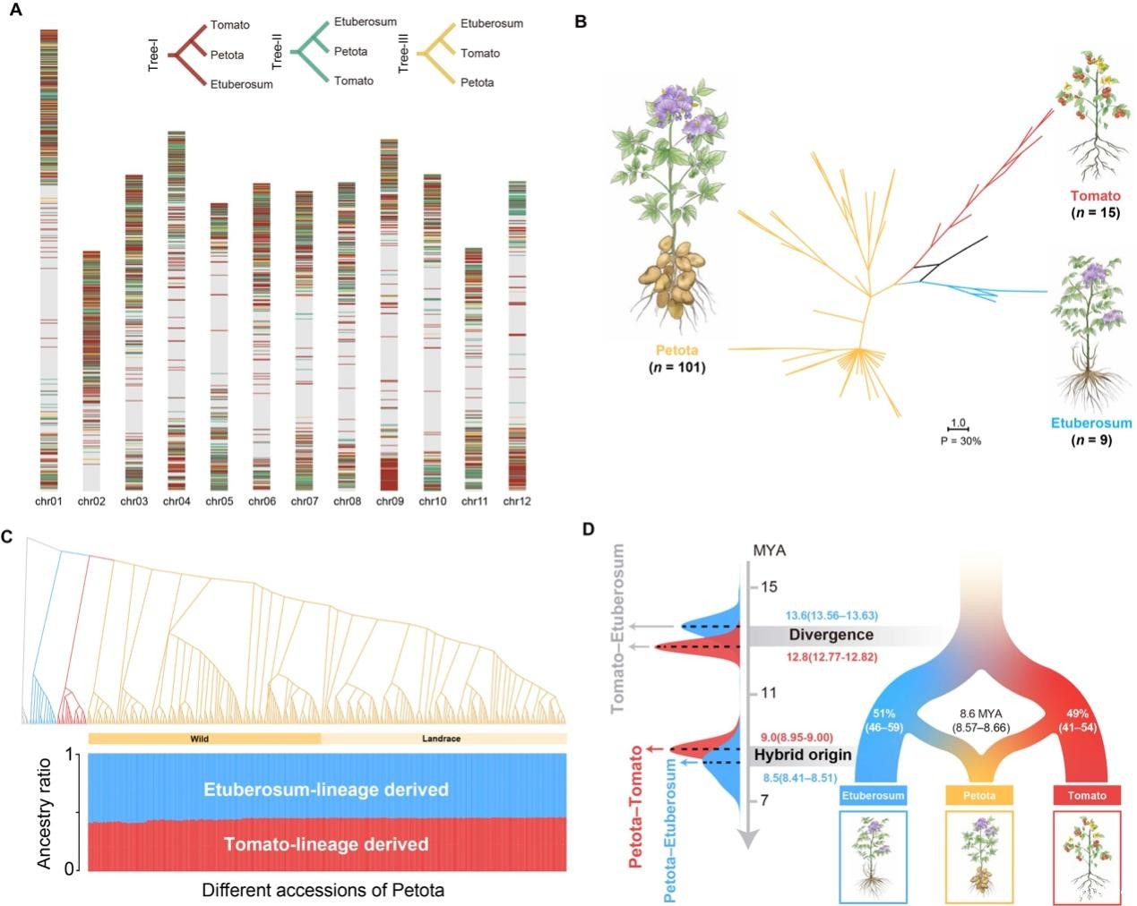 该研究首次揭示了马铃薯起源于番茄与类马铃薯祖先种之间的一次古老杂交事件,并导致新器官薯块的产生,加速马铃薯物种爆发式的辐射分化。
