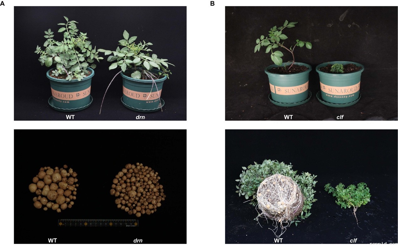 图3|两个薯块功能重要基因DRN和CLF的突变体表型