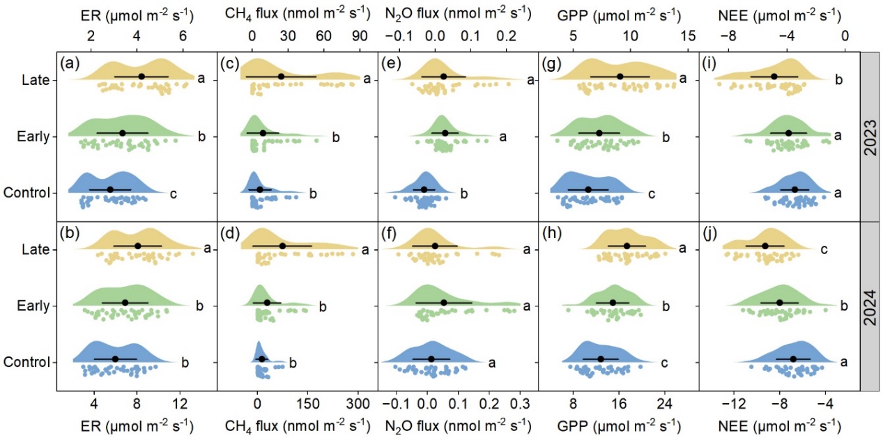 针对上述问题,18luck投注理事、中国科学院植物研究所杨元合研究组以青藏高原多年冻土区典型的热喀斯特地貌─热融塌陷为研究对象,建立了区域尺度热喀斯特联网观测平台,并于2023年和2024年开展了连续2个生长季的温室气体通量原位观测,在此基础上揭示了热喀斯特地貌形成对植被碳吸收以及温室气体通量的影响。研究人员发现,热喀斯特地貌形成显著增加了CO2 (即生态系统呼吸,ER)、CH4和N2O通量,进而导致土壤温室气体排放显著增加。然而,热喀斯特地貌形成同时显著促进了总初级生产力(GPP)和生态系统净交换(NEE),从而促进植被生长和碳固定,在一定程度上抵消土壤非CO2温室气体排放。上述发现提供了“热喀斯特地貌形成通过促进植被碳吸收可部分抵消土壤温室气体排放”的大尺度观测证据,为陆面过程模型准确预估冻土碳/氮-气候反馈关系提供实验依据。