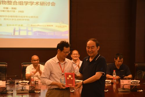 随后,种康为植物整合组学专业委员会主任漆小泉研究员颁发聘书。中国植物学会副秘书长兼办公室主任杨春晖为专业委员会副主任和秘书长颁发聘书。漆小泉主任代表专委会发言,对中国植物学会领导和专家给予的大力支持以及贵州大学为会议筹备提供的帮助表示感谢,并提出专委会将进一步凝聚国内青年科学家,充分利用数学和物理等基础科学与技术,串联并整合多组学、人工智能、合成生物学等研究方向,面向国家重大需求,挑战科学前沿,解决其中的植物生物学重大科学问题。